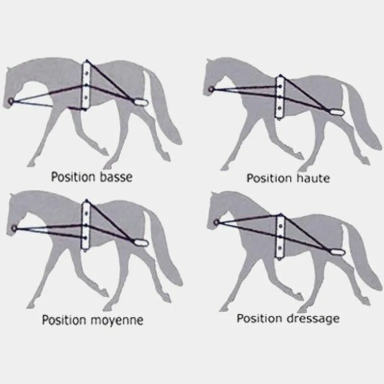 - Comme pour tous les enrênements, il est important de ne pas le régler trop court, particulièrement en début de séance, le but n’étant pas d’emprisonner le cheval ce qui provoquerait des défenses mais de fixer un cadre dans lequel le cheval peut se mettre en place librement.
