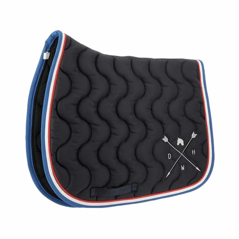 - Tapis de selle marine/ vernis blanc/ tresse rouge/ bordure bleu roi