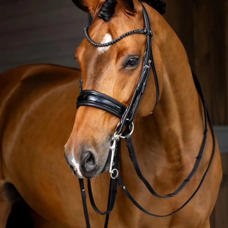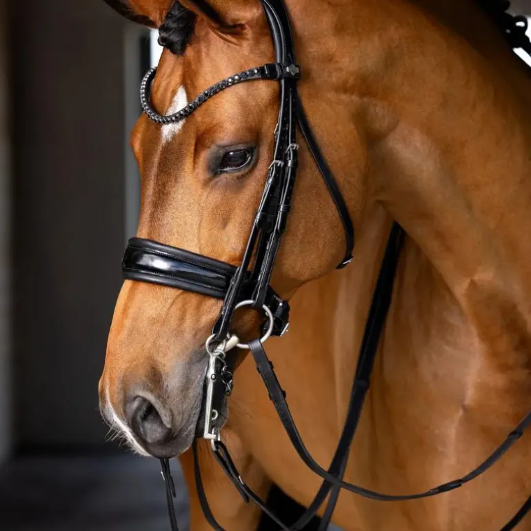 • Muserolle en cuir verni rembourré en gel pour du confort