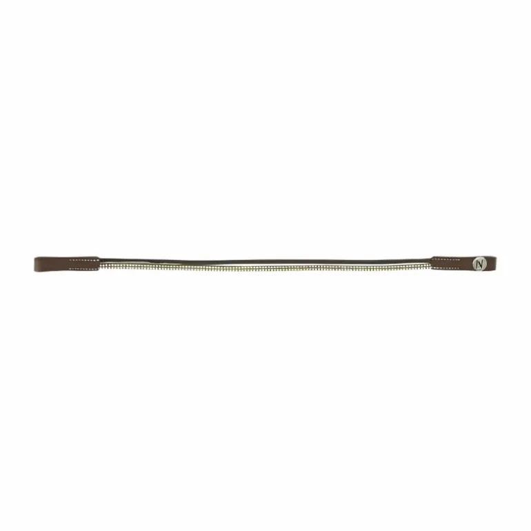 - Frontal en cuir de buffle avec deux lanières : une en polyuréthane aspect cuir vernis et une en polyester ornée de petits clous brillants.