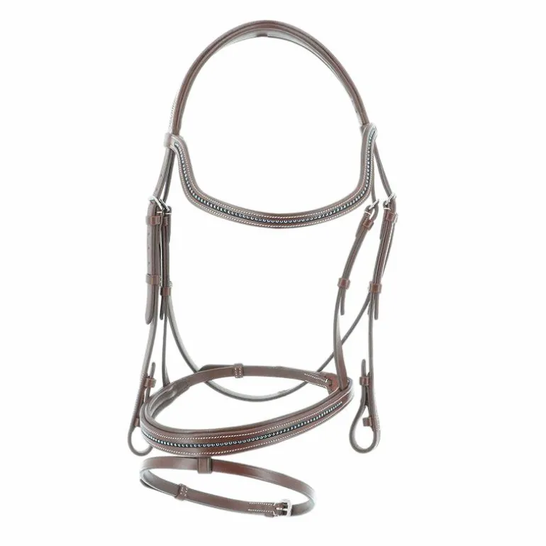 - Frontal découpé et muserolle surmontés d’une ligne de perles.