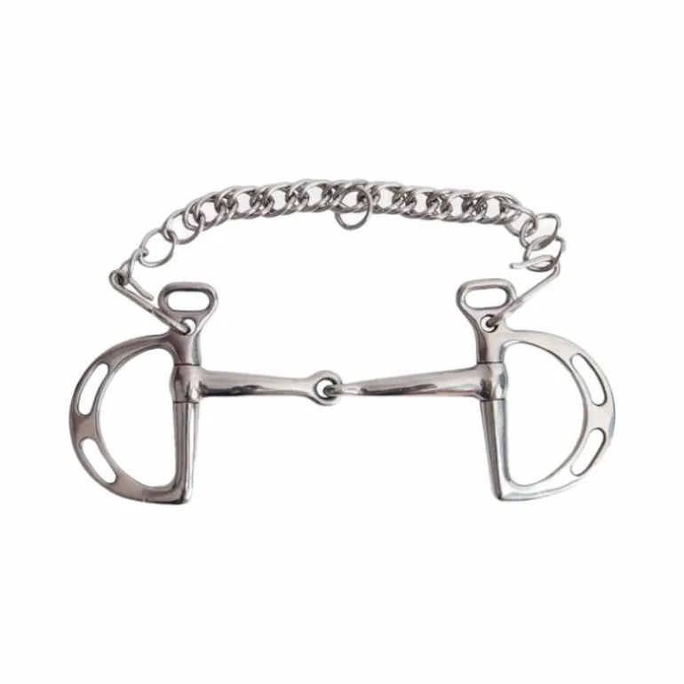 - Le mors Espagnol s’utilise avec une gourmette. Il se présente comme un mors classique mais les anneaux sont en forme de demi-lune munies d’encoches sur lesquelles on vient fixer les rênes.