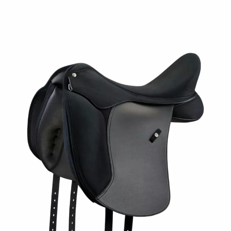 • Selle de dressage haut de gamme qui offre un bon grip et facilite la descente de jambe optimisant la position et le fonctionnement de l’assiette du cavalier