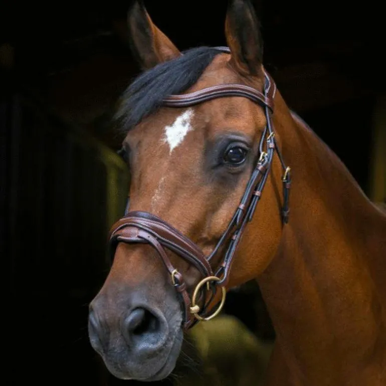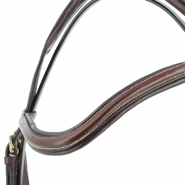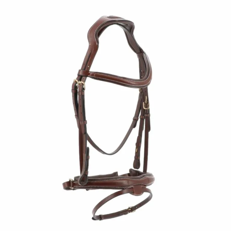 • Bridon en cuir de buffle, têtière découpée large, frontal en »V » et muserolle combinée, doublés cuir vachette matelassé.
