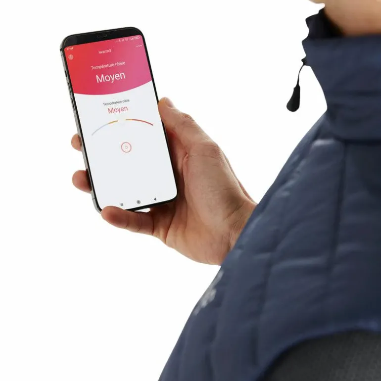 • La technologie s’active via un bouton situé sur le côté de la veste. La température se module sur le bouton ou via l’application « iwarm3 » téléchargeable sur smartphone