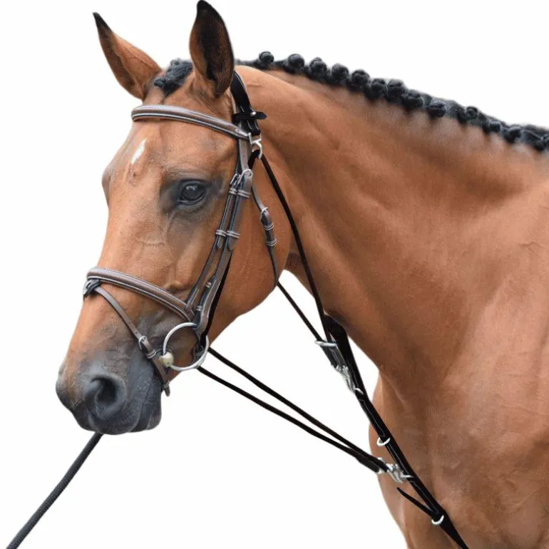 - Comme pour tous les enrênements, il est important de ne pas le régler trop court, particulièrement en début de séance, le but n’étant pas d’emprisonner le cheval ce qui provoquerait des défenses mais de fixer un cadre dans lequel le cheval peut se mettre en place librement.