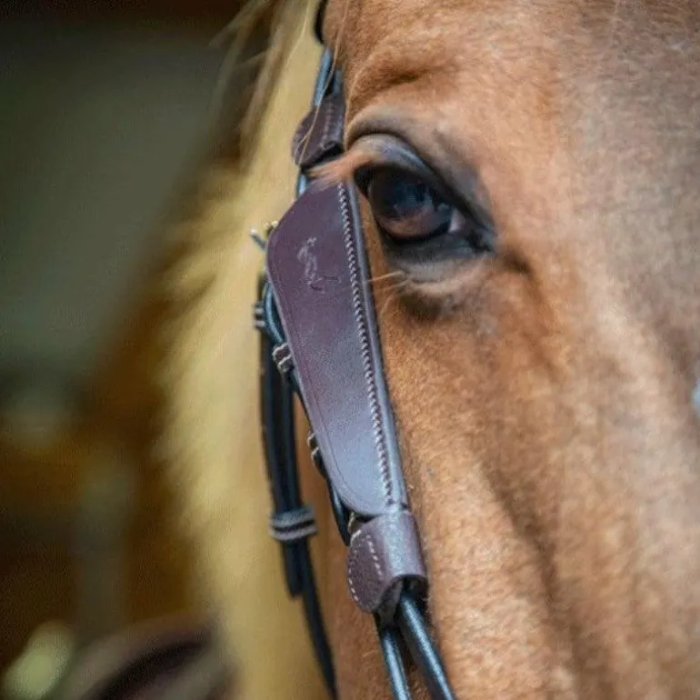 - Œillères en cuir à poser sur un bridon pour favoriser la concentration du cheval au travail sur le plat ou à l’obstacle